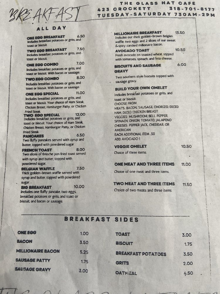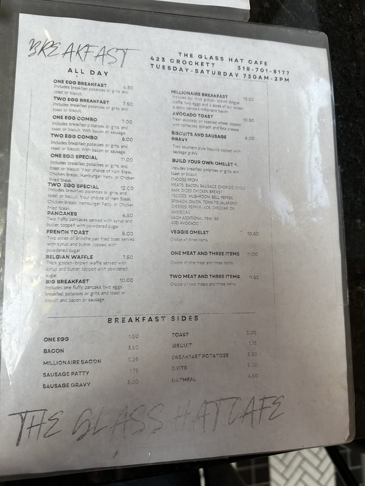 Welcome to The Glass Hat Cafe, where American breakfast and brunch shine with soul and flavor. Located in Shreveport, LA, this charming spot invites you to indulge in classics like Chicken Fried Steak and the hearty Big Breakfast. Each dish is crafted with care, ensuring generous portions at astonishing prices.